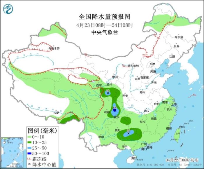 4月23日08時至24日08時,新疆北疆北部、青海南部、西藏北部等地部分地區有小到中雪或雨夾雪。西藏東南部、西北地區東南部、西南地區東部、華南北部等地部分地區有中到大雨,其中,四川盆地中部等地部分地區有暴雨(50~60毫米)。內蒙古、西藏北部等地部分地區有4~6級風(見圖2)。