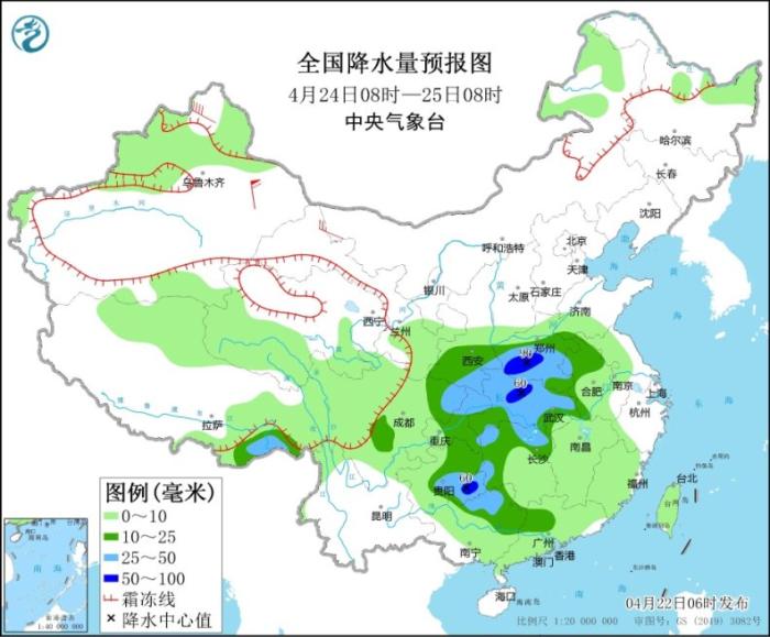 4月24日08時至25日08時,新疆北疆北部、青海南部、西藏北部等地部分地區有小到中雪或雨夾雪。西藏東南部、西北地區東南部、西南地區東部、黃淮西部、江淮西部、江漢、江南北部、華南北部等地部分地區有中到大雨,其中,河南西南部、湖北北部、貴州東南部等地部分地區有暴雨(50~90毫米)。內蒙古西北部、新疆北疆北部等地部分地區有4~6級風,其中,新疆東部部分地區有6~8級風(見圖3)。