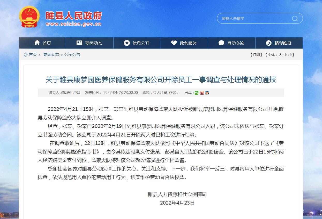 通報(bào)稱,4月21日15時(shí),張某、彭某到睢縣勞動(dòng)保障監(jiān)察大隊(duì)投訴被睢縣康夢(mèng)園醫(yī)養(yǎng)保健服務(wù)有限公司開除,睢縣勞動(dòng)保障監(jiān)察大隊(duì)立即介入調(diào)查。