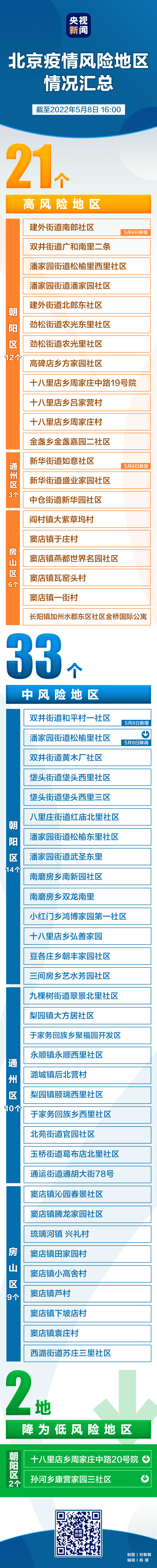 截至2022年5月7日24時,朝陽區十八里店鄉周家莊中路20號院、孫河鄉康營家園三社區近14天各累計報告1例本土確診病例。經北京市疾控中心評估,按照《北京市新冠肺炎疫情風險分級標準》,即日起將朝陽區十八里店鄉周家莊中路20號院、孫河鄉康營家園三社區由中風險地區降為低風險地區。