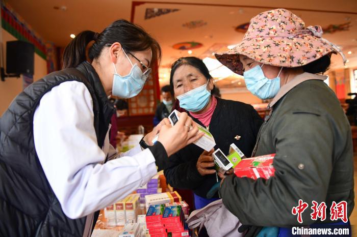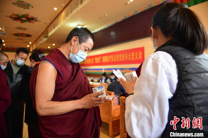 圖為醫護人員為哲蚌寺僧眾發放藥品。 貢嘎來松 攝
