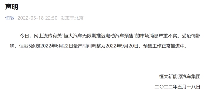中新財經5月19日電 據“恒馳”公眾號18日晚消息,網上流傳有關“恒大汽車無限期推遲電動汽車預售”的市場消息嚴重不實。受疫情影響,恒馳5原定2022年6月22日量產時間調整為2022年9月20日,預售工作正常推進中。(完)