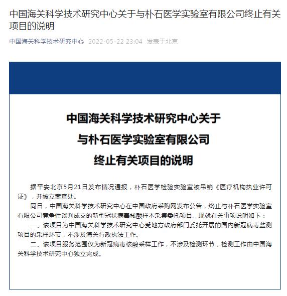 中新網5月23日電 中國海關科學技術研究中心22日在其微信公眾號發布關于與樸石醫學實驗室有限公司終止有關項目的說明稱,據平安北京5月21日發布情況通報,樸石醫學檢驗實驗室被吊銷《醫療機構執業許可證》,并被立案查處。同日,中國海關科學技術研究中心在中國政府采購網發布公告,終止與樸石醫學實驗室有限公司競爭性談判成交的新型冠狀病毒核酸樣本采集委托項目。