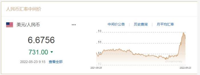 中新財經5月23日電(記者 李金磊) 中國人民銀行授權中國外匯交易中心公布,2022年5月23日銀行間外匯市場人民幣匯率中間價為:1美元對人民幣6.6756元。這較上一交易日大幅調升731個基點。此外,在岸人民幣、離岸人民幣對美元匯率也已升回6.6元時代。(完)