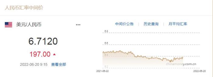人民幣對美元中間價下調(diào)197個基點 1美元對人民幣6.7120元