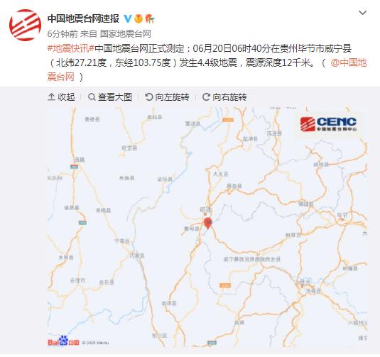 中新網6月20日電 中國地震臺網正式測定:6月20日6時40分在貴州畢節市威寧縣(北緯27.21度,東經103.75度)發生4.4級地震,震源深度12千米。
