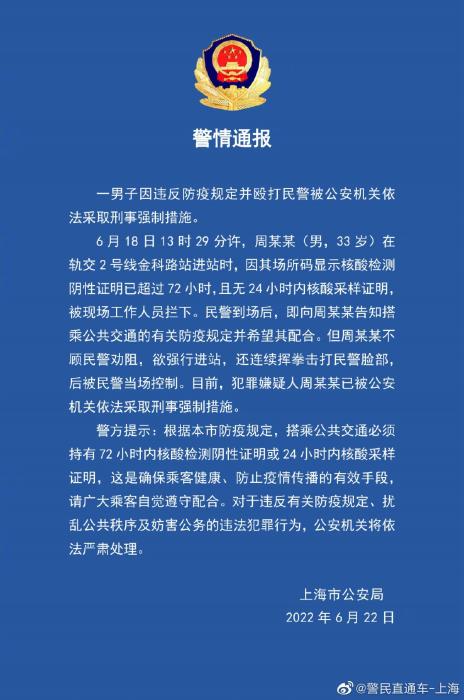 6月18日13時(shí)29分許,周某某(男,33歲)在軌交2號(hào)線金科路站進(jìn)站時(shí),因其場所碼顯示核酸檢測陰性證明已超過72小時(shí),且無24小時(shí)內(nèi)核酸采樣證明,被現(xiàn)場工作人員攔下。民警到場后,即向周某某告知搭乘公共交通的有關(guān)防疫規(guī)定并希望其配合。但周某某不顧民警勸阻,欲強(qiáng)行進(jìn)站,還連續(xù)揮拳擊打民警臉部,后被民警當(dāng)場控制。目前,犯罪嫌疑人周某某已被公安機(jī)關(guān)依法采取刑事強(qiáng)制措施。