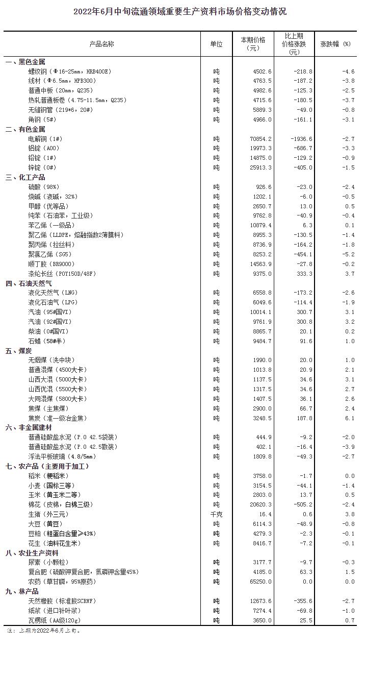 中新財經6月24日電 6月24日,國家統計局發布6月中旬流通領域重要生產資料市場價格變動情況。對全國流通領域9大類50種重要生產資料市場價格的監測顯示,2022年6月中旬與6月上旬相比,18種產品價格上漲,30種下降,2種持平。其中,生豬(外三元)價格為16.4元/千克,與上期價格相比,每公斤上漲0.6元,上漲幅度為3.8%。(完)