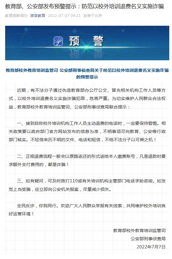 中新網7月7日電 據教育部微信公眾號消息,教育部、公安部7日聯合發布《關于防范以校外培訓退費名義實施詐騙的預警提示》稱,近期,有不法分子通過偽造教育部辦公廳公文、冒充相關機構工作人員等方式,以校外培訓退費名義實施詐騙犯罪,危害嚴重。為切實維護人民群眾合法權益,教育部校外教育培訓監管司、公安部刑事偵查局提示: