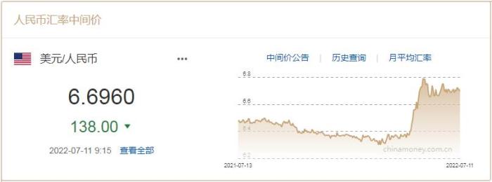 中新網7月11日電 中國人民銀行授權中國外匯交易中心公布,7月11日,銀行間外匯市場人民幣對美元匯率中間價報6.6960元,調升138個基點。(中新財經)