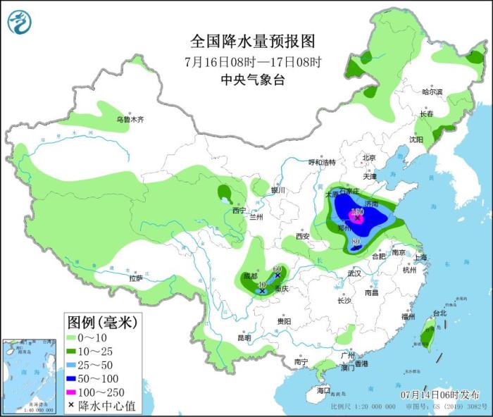 7月16日08時至17日08時,華北南部、黃淮大部、江淮大部、四川盆地南部、臺灣島中南部等地部分地區有中到大雨,其中,山西東南部、河北南部、山東西部、河南東北部和南部、安徽北部、江蘇北部等地部分地區有暴雨或大暴雨(100~150毫米)。