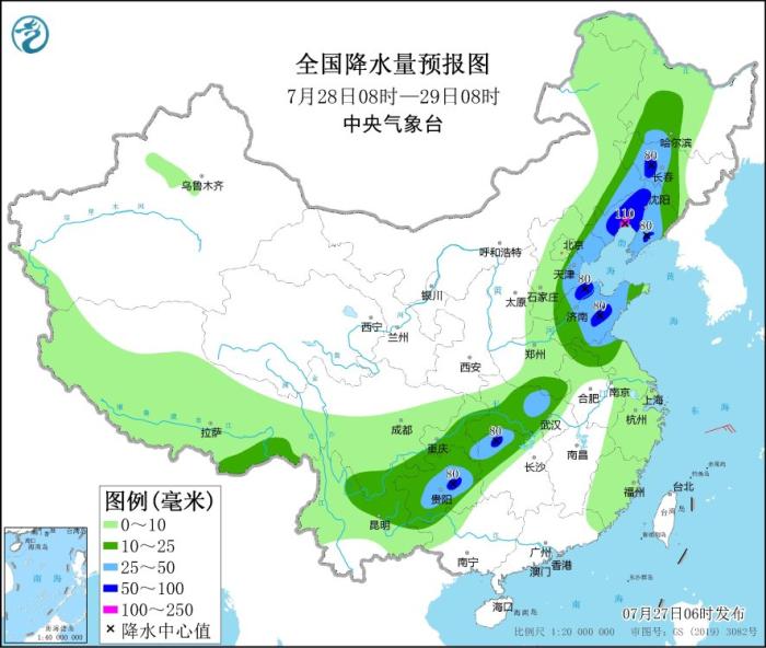7月28日08時至29日08時,內蒙古東南部、東北地區西部和南部、華北東部、黃淮東部、江漢大部、湖南北部和西部、西南地區東南部等地部分地區有中到大雨,其中,遼寧中西部、山東中部、湖南北部、貴州中部等地部分地區有暴雨,局地大暴雨(100~110毫米)(見圖3)。