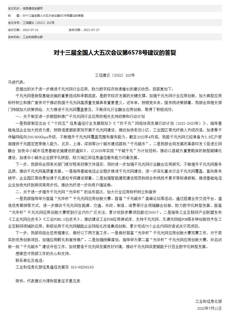 中新網(wǎng)7月27日電 工信部網(wǎng)站27日發(fā)布對(duì)十三屆全國人大五次會(huì)議第6578號(hào)建議的答復(fù)。工信部表示,下一步,將會(huì)同有關(guān)部門抓好既有政策文件落實(shí),同時(shí)進(jìn)一步加強(qiáng)千兆光網(wǎng)行業(yè)融合應(yīng)用研究,不斷提升千兆光網(wǎng)服務(wù)品質(zhì),推動(dòng)千兆光網(wǎng)高質(zhì)量發(fā)展。一是指導(dǎo)基礎(chǔ)電信企業(yè)穩(wěn)步推進(jìn)千兆光網(wǎng)建設(shè),進(jìn)一步深化重點(diǎn)行業(yè)千兆光網(wǎng)覆蓋,面向商務(wù)樓宇、企業(yè)園區(qū)等場(chǎng)景加速千兆虛擬專網(wǎng)建設(shè)部署。二是加強(qiáng)智能建筑建設(shè)規(guī)范和綜合布線技術(shù)要求等標(biāo)準(zhǔn)研制,推進(jìn)基礎(chǔ)電信企業(yè)加快光纖到房間商用步伐,推動(dòng)光纖進(jìn)一步向用戶端延伸。(中新財(cái)經(jīng))