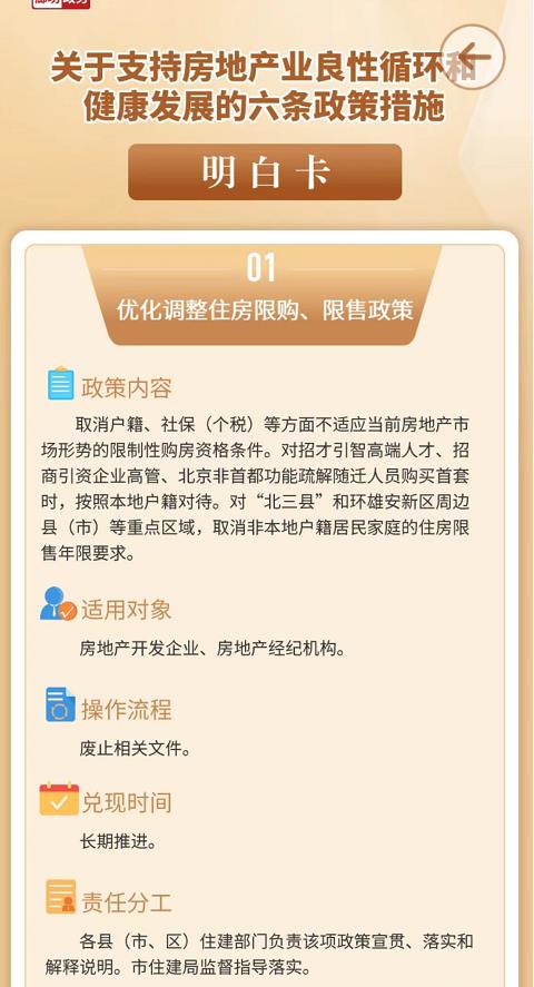 根據政策明白卡,廊坊優化調整住房限購、限售政策。取消戶籍、社保(個稅)等方面不適應當前房地產市場形勢的限制性購房資格條件。對招才引智高端人才、招商引資企業高管、北京非首都功能疏解隨遷人員購買首套時,按照本地戶籍對待。對“北三縣”和環雄安新區周邊縣(市)等重點區域,取消非本地戶籍居民家庭的住房限售年限要求。