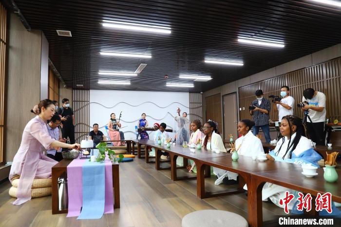 留學生還更換漢服、唐裝,跟隨老師學習茶藝,并品嘗了自己親手泡制的泰山女兒茶。在品茶之余,大家又一起體驗了中國古典樂器之美,一曲享譽海內外的中國民歌《茉莉花》,讓在場的留學生一起跟著哼唱,體悟中國傳統文化的魅力。