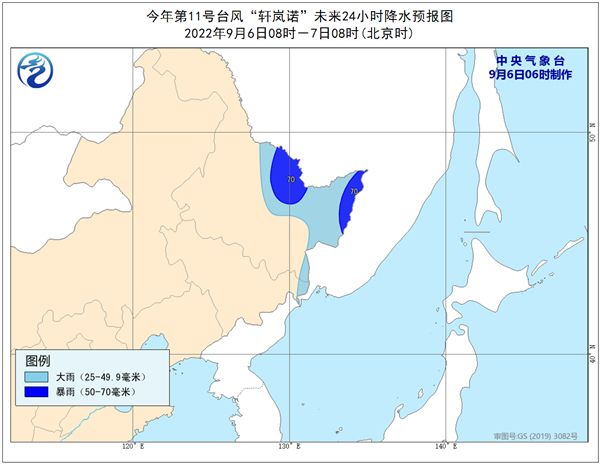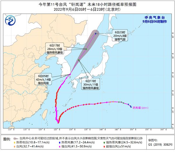 大風預報:9月6日08時至7日08時,東海東北部、黃海中東部和東南部有6-7級大風,陣風8-9級;我國東北地區東北部有4-5級風,陣風6-7級,局地8級。朝鮮海峽、日本海大部有8-11級大風,“軒嵐諾”中心經過的附近海面的風力有12-14級,陣風可達15-16級。
