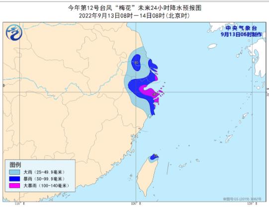 降水預(yù)報(bào):9月13日8時(shí)至14日8時(shí),臺(tái)灣島北部、浙江北部、上海、江蘇東南部等地將有大到暴雨,其中浙江東北部和上海等地的部分地區(qū)有大暴雨(100-140毫米)。