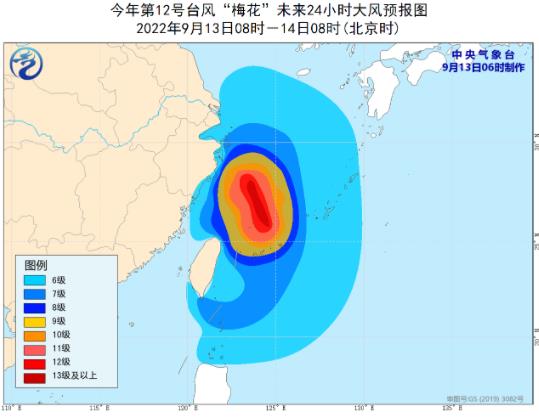 預(yù)計(jì),“梅花”將以每小時(shí)10-15公里的速度向偏北轉(zhuǎn)西北方向移動(dòng),強(qiáng)度還將有所加強(qiáng),逐漸向浙江溫嶺到舟山一帶沿海靠近,并將于14日下午至夜間在上述沿海地區(qū)登陸(臺(tái)風(fēng)級(jí)或強(qiáng)臺(tái)風(fēng)級(jí),38-45米/秒,13-14級(jí));登陸之后,“梅花”將繼續(xù)向西北方向移動(dòng),強(qiáng)度逐漸減弱。