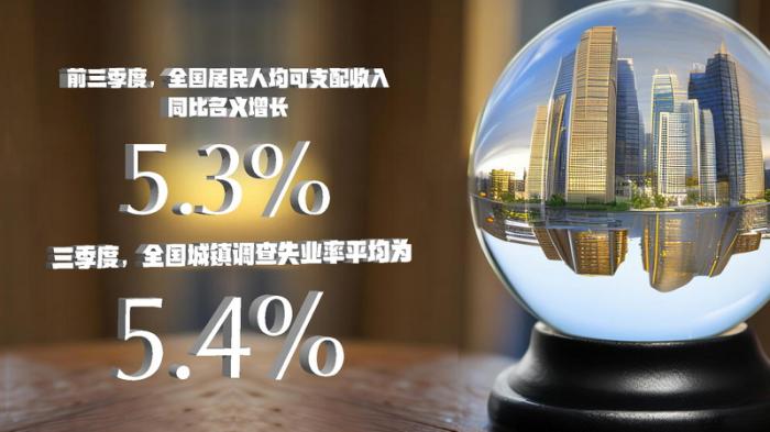 就業形勢總體穩定,居民收入平穩增長。前三季度,全國城鎮調查失業率平均為5.6%,其中三季度平均為5.4%,比二季度下降0.4個百分點。全國居民人均可支配收入27650元,同比名義增長5.3%;扣除價格因素實際增長3.2%,比上半年加快0.2個百分點;全國居民人均可支配收入中位數23277元,同比名義增長5.1%。