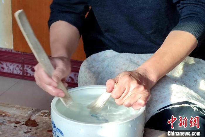 在水中反復梳洗毛筆頭是制筆的重要環節?!枪跇?攝