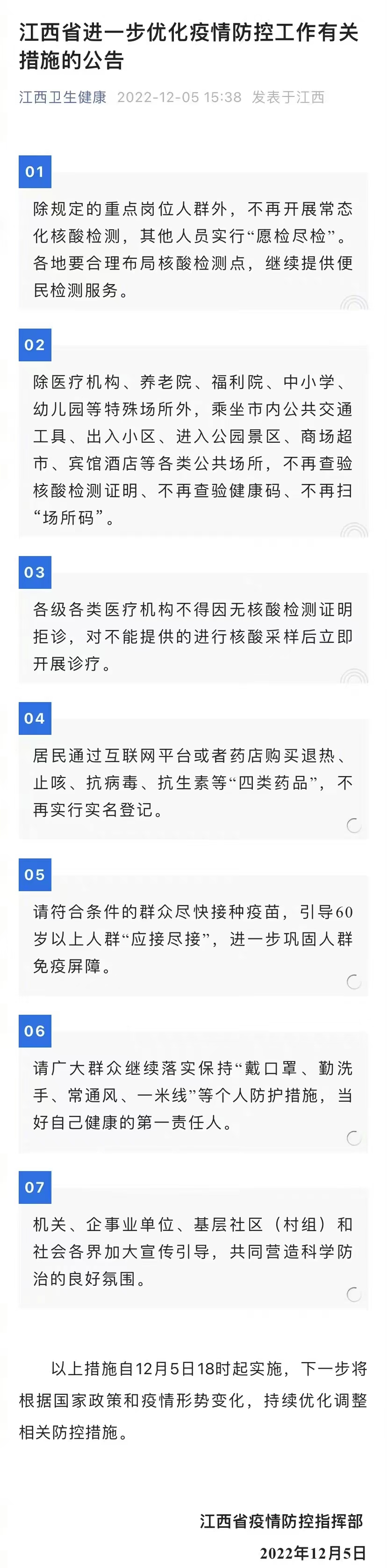《江西省進一步優化疫情防控工作有關措施的公告》截圖