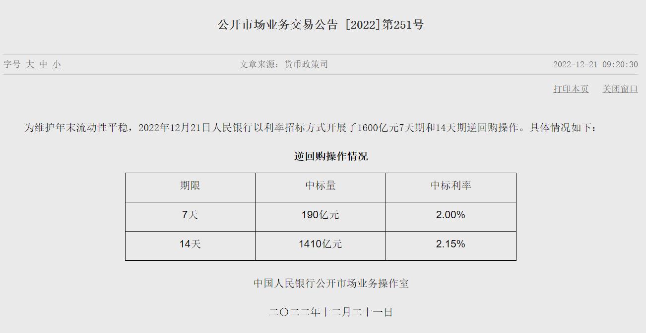中新網12月21日電 據央行官網消息,為維護年末流動性平穩,2022年12月21日人民銀行以利率招標方式開展了1600億元7天期和14天期逆回購操作。中標利率分別為2.00%和2.15%。(中新財經)