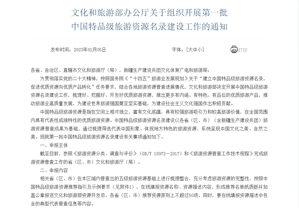 文旅部:開展第一批中國特品級旅游資源名錄建設工作