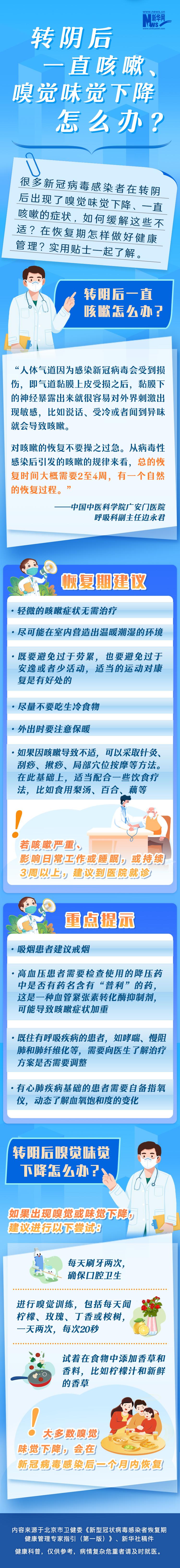 很多新冠病毒感染者在轉陰后出現了嗅覺味覺下降、一直咳嗽的癥狀,如何緩解這些不適?在恢復期怎樣做好健康管理?實用貼士一起了解。