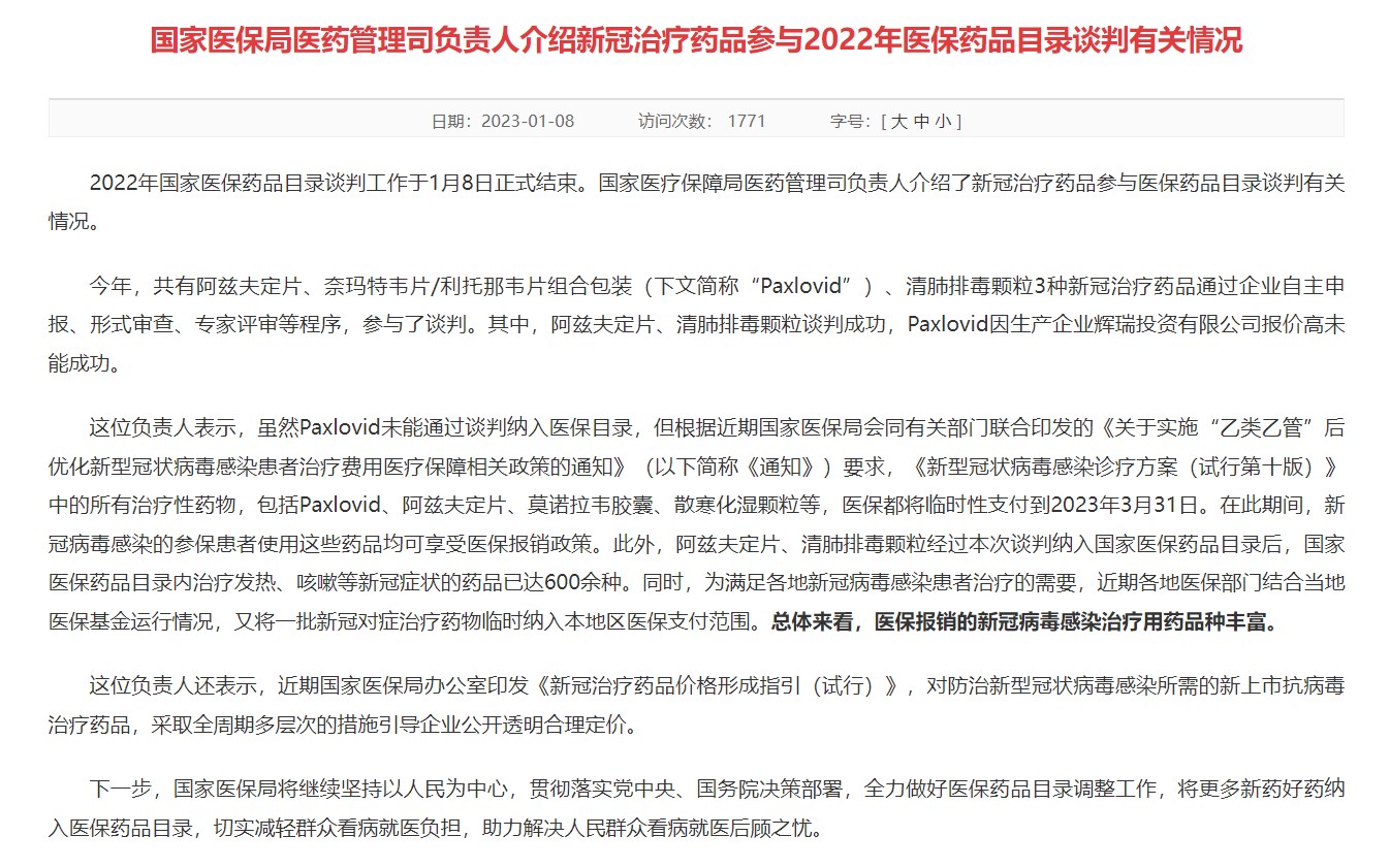 上述負責人還表示,雖然Paxlovid未能通過談判納入醫保目錄,但根據近期國家醫保局會同有關部門聯合印發的《關于實施“乙類乙管”后優化新型冠狀病毒感染患者治療費用醫療保障相關政策的通知》,《新型冠狀病毒感染診療方案(試行第十版)》中的所有治療性藥物,包括Paxlovid、阿茲夫定片、莫諾拉韋膠囊、散寒化濕顆粒等,醫保都將臨時性支付到2023年3月31日。在此期間,新冠病毒感染的參保患者使用這些藥品均可享受醫保報銷政策。