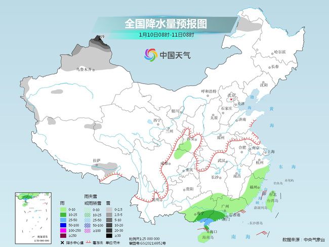 降水方面,今天,我國降水區域仍集中在一南一北:新疆北部及華南地區,新疆多地有強降雪現身,廣東、廣西的部分地區或有大雨。具體來看,今天,內蒙古東北部、新疆北部和西部山區等地部分地區有小到中雪,其中,新疆北疆北部等地部分地區有大到暴雪(10~19毫米)。江南東南部、華南大部、臺灣島等地部分地區有小到中雨,其中,廣西東南部沿海、廣東西南部等地部分地區有大雨。