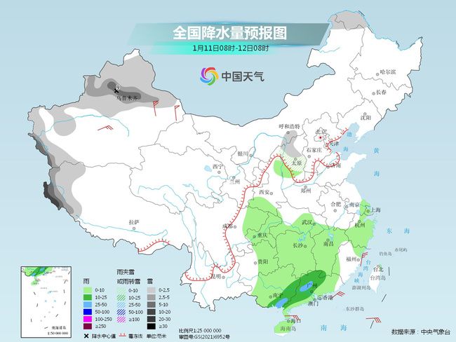 明天,隨著補充弱冷空氣南下,暖濕氣流增強,我國中東部雨雪天氣將增多,其中黑龍江西北部、新疆北部和西部山區、西藏西部、陜西北部、山西中北部等地部分地區有小到中雪或雨夾雪,其中,新疆沿天山地區、西藏西部等地局地有大到暴雪。江漢南部、江南大部、西南地區東部、華南等地部分地區有小到中雨,局地有大雨。