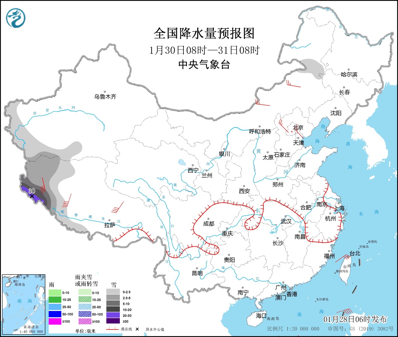 全國降水量預報圖(1月28日08時-29日08時)。圖片來源:中央氣象臺網站