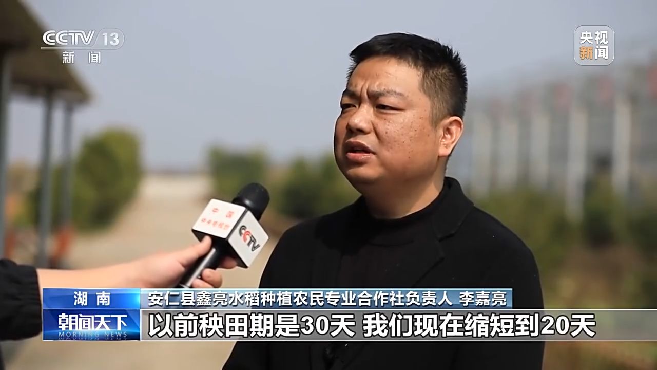 湖南省安仁縣鑫亮水稻種植農(nóng)民專業(yè)合作社負責人 李嘉亮:以前秧田期是30天,我們現(xiàn)在縮短到20天,可以為周邊的農(nóng)戶提供2.5萬畝到3萬畝的秧苗。