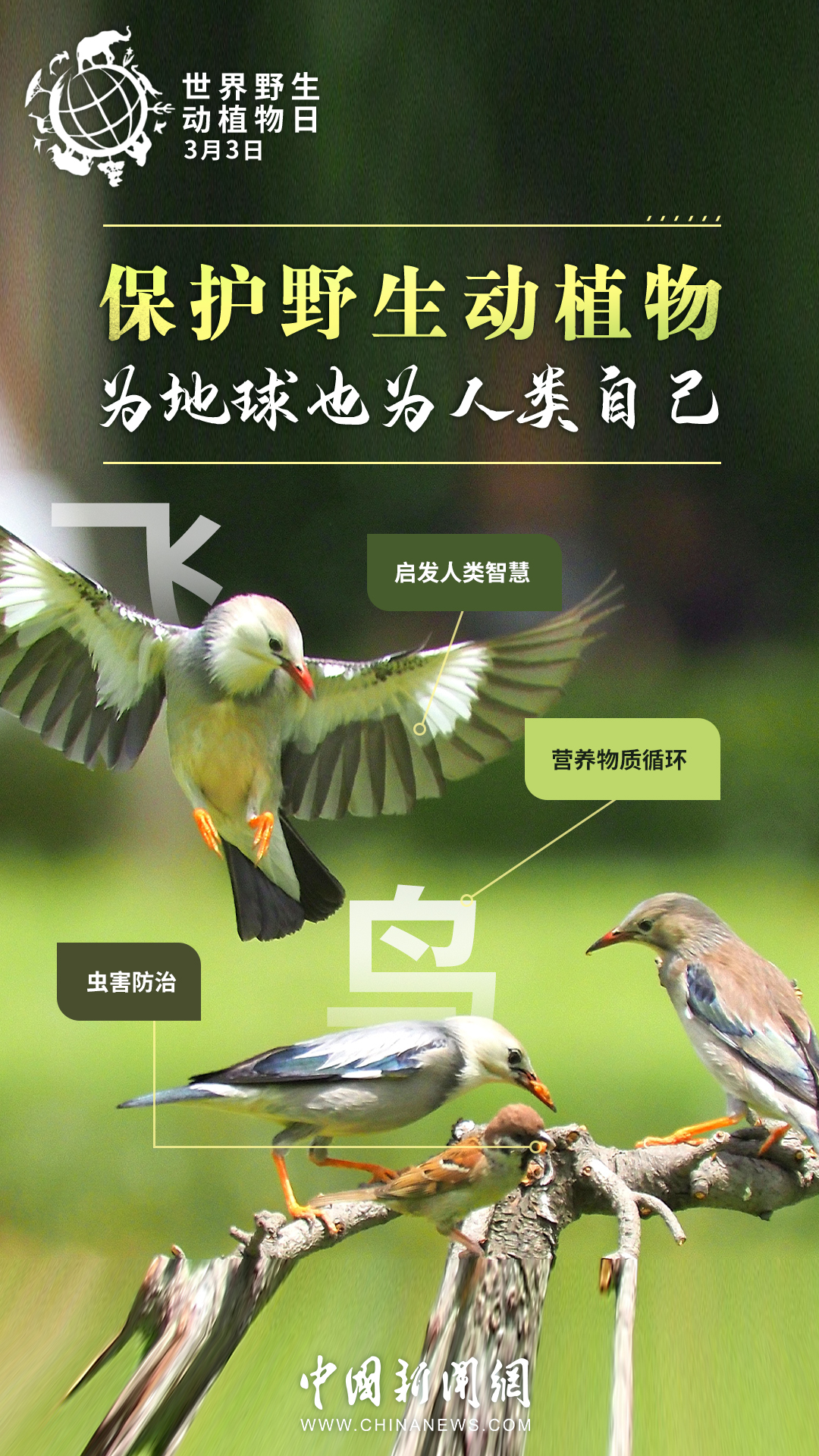 世界約80%的農作物都依賴蜜蜂等蟲媒傳粉,一座鯨的尸體可以供養一套以分解者為主的循環系統長達百年……其實,大自然里的每種生物都有它存在的價值。今天是第十個“世界野生動植物日”,戳圖了解它們的作用,一起來保護野生動植物。