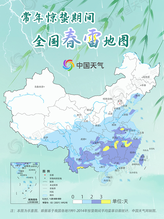 從中國天氣網推出的驚蟄節氣全國春雷地圖看,“驚蟄始雷”只與我國南方部分地區的氣候比較吻合。常年驚蟄期間,江南大部、云南大部、貴州南部、重慶中部、華南北部等地雷響頻繁,平均雷暴日數在2天以上,湖南、江西的部分地區可超過3天;最符合“驚蟄始雷”的是長江流域,合肥、福州、廣州、南京、杭州、上海等不少地方都在此時節迎來初雷。