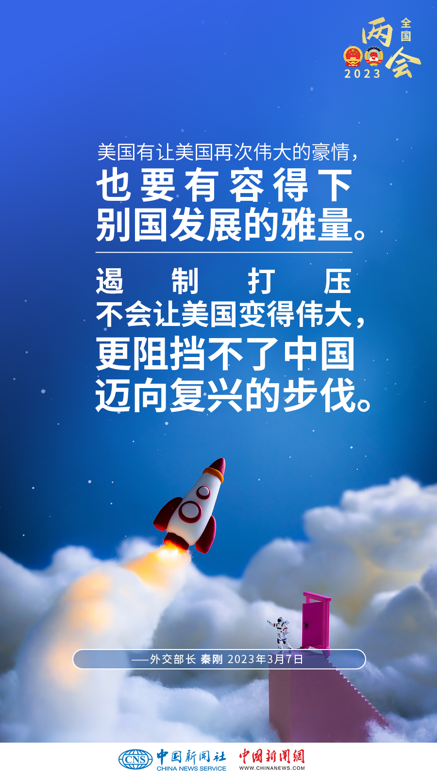 秦剛:如果美方不踩剎車,繼續(xù)沿著錯誤道路狂飆下去,再多的護欄也擋不住脫軌翻車,必然陷入沖突對抗。誰來承擔其災(zāi)難性的后果?!這樣的競爭,就是以兩國人民根本利益乃至人類前途命運為賭注的豪賭,中方當然堅決反對。美國有讓美國再次偉大的豪情,也要有容得下別國發(fā)展的雅量。遏制打壓不會讓美國變得偉大,更阻擋不了中國邁向復興的步伐。