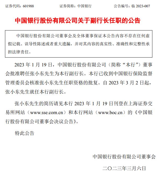 中國銀行6日發布的公告顯示,2023年1月19日,中國銀行董事會批準聘任張小東為該行副行長。該行已收到銀保監會核準張小東任職資格的批復。自2023年3月2日起,張小東就任中國銀行副行長。