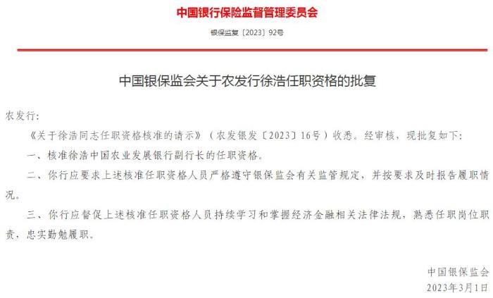 中國銀保監會6日公布的《中國銀保監會關于農發行徐浩任職資格的批復》顯示,核準徐浩中國農業發展銀行副行長的任職資格。(中新財經)