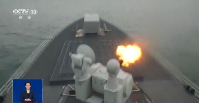 剛剛到達預定海域,無錫艦雷達就發現海上目標,官兵立即進入戰斗狀態。鎖定目標后,無錫艦主炮連續開火成功摧毀海上目標。此時,雷達發現空中目標來襲。雷達鎖定目標后,副炮迅速對空中目標進行打擊。同時,無錫艦連續發射多枚干擾彈,并快速機動規避。