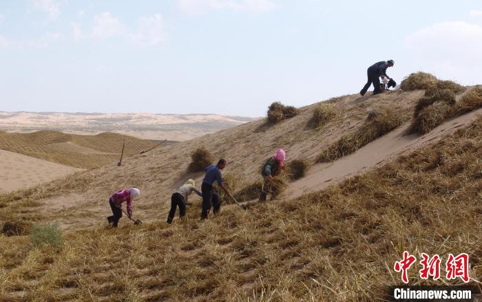白芨灘林場員工扎麥草方格進行治沙(資料圖)。 寧夏靈武白芨灘國家級自然保護區管理局供圖