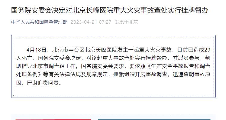國務院安委會決定對北京長峰醫院重大火災事故查處實行掛牌督辦
