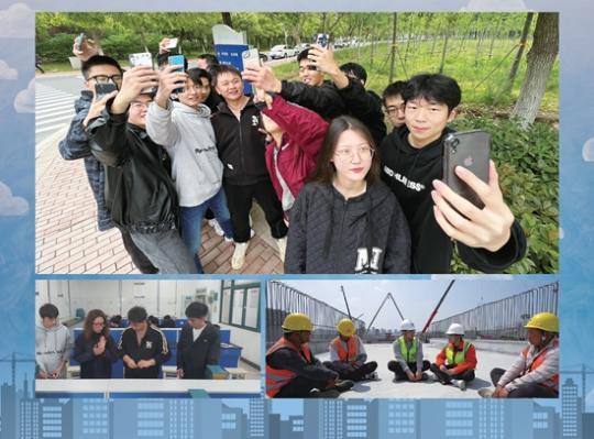 95后汪澤偉(上圖中間黑色衣服,左下圖右二)和00后王檜耀(右下圖右二)“身份互換”后的場景。中鐵四局、安徽建筑大學供圖