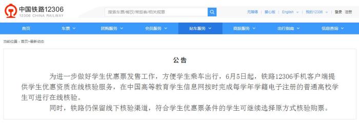 同時,鐵路仍保留線下核驗渠道,符合學生優(yōu)惠票條件的學生可繼續(xù)選擇原方式核驗購票。