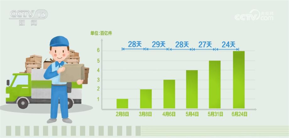 今年以來,從2月8日我國快遞業務量超100億件起,每個月快遞業務量都以百億件為增量。28天,快遞業務量從100億件到200億件(3月8日),29天達300億件(4月6日),28天從300億件到400億件(5月4日),27天達500億件(5月31日),從500億件到600億件(6月24日)只花了24天。