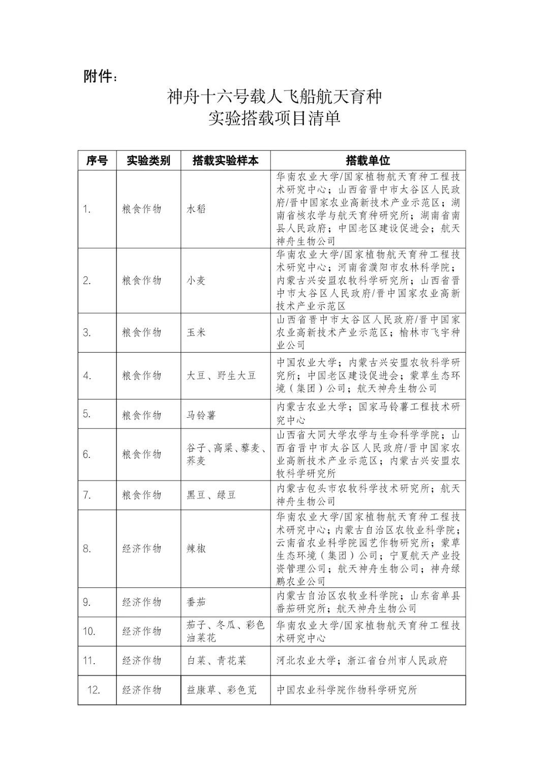 今日,中國載人航天工程辦公室公布神舟十六號載人飛船航天育種實驗項目清單,詳情如下: