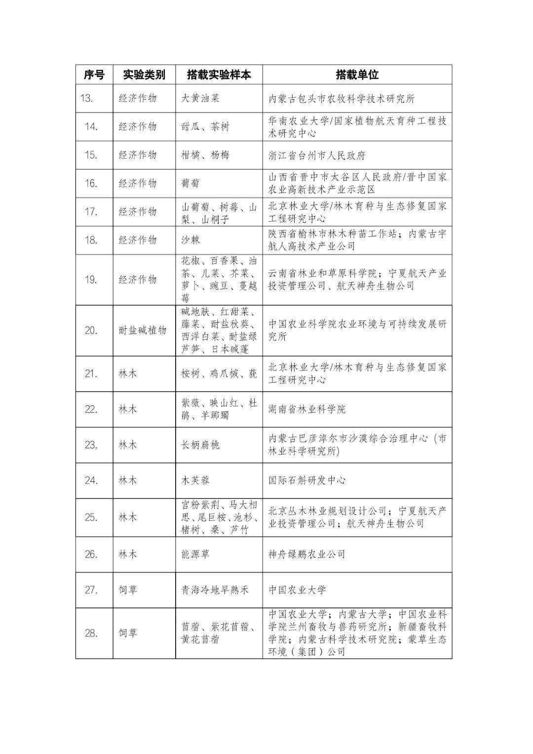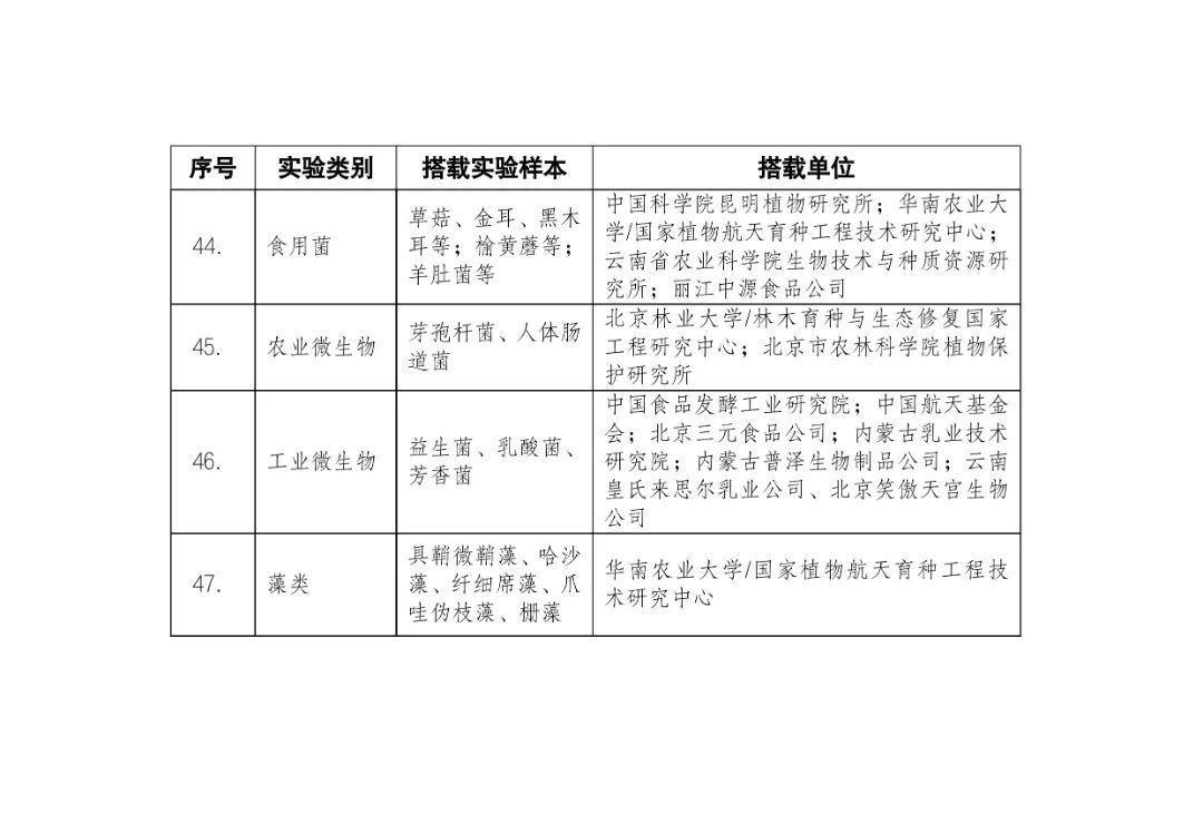 載人航天工程立項實施以來,始終注重提升工程綜合效益,致力服務國家經濟社會發展。在工程歷次飛行任務中,均安排了航天育種搭載實驗項目。從神舟十六號載人飛船開始,中國載人航天工程辦公室向社會公開征集航天育種搭載實驗項目,于3月23日在工程官網發布《關于征集神舟系列載人飛船航天育種實驗項目的機會公告》,同時在工程官網開辟“航天育種搭載實驗”管理平臺,接受搭載需求單位申報實驗項目。辦公室組織專家對申報項目進行評審,遴選出53個單位的136種份航天育種實驗材料實施搭載。包括農作物47份(糧食作物種子12份、經濟作物種子28份、耐鹽堿植物7份);林草、花卉和藥用植物76份(林木17份、飼草21份、花卉7份、藥用植物31份);微生物和其它13種(農業微生物菌種2種、工業微生物菌種3種、食用菌3種、藻類和苔蘚5種)(清單附后)。