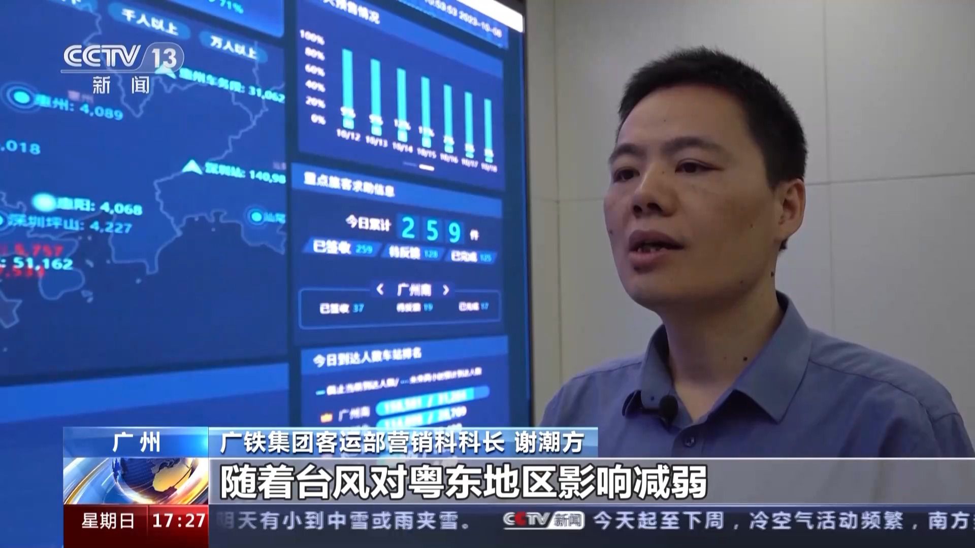 廣鐵集團(tuán)客運(yùn)部營銷科科長謝潮方:隨著臺風(fēng)對粵東地區(qū)影響減弱,今天,杭深、廣汕等線路列車運(yùn)行秩序恢復(fù)正常。中秋國慶假期的后幾天,仍是返程客流高峰,我們將加強(qiáng)線路檢查,確保運(yùn)輸安全。