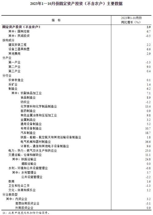 國家統計局:1—10月份全國固定資產投資增長2.9%