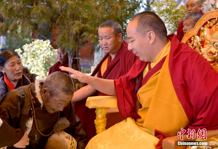 11月13日、14日,全國政協常委、中國佛教協會副會長、中國佛教協會西藏分會會長班禪額爾德尼·確吉杰布在日喀則扎什倫布寺為數萬名信教群眾摸頂賜福。圖為11月13日,班禪為信眾摸頂賜福。