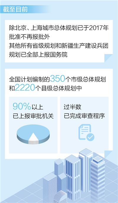 自然資源部國土空間規劃局局長張兵介紹,截至目前,除北京、上海城市總體規劃已于2017年批準不再報批外,其他所有省級規劃和新疆生產建設兵團規劃已全部上報國務院,其中江蘇、廣東、寧夏等省級規劃已經批復。全國計劃編制的350個市級總體規劃和2220個縣級總體規劃中,90%以上已上報審批機關,過半數已完成審查程序,江蘇、廣東的部分市級總體規劃已由省級人民政府批準實施。